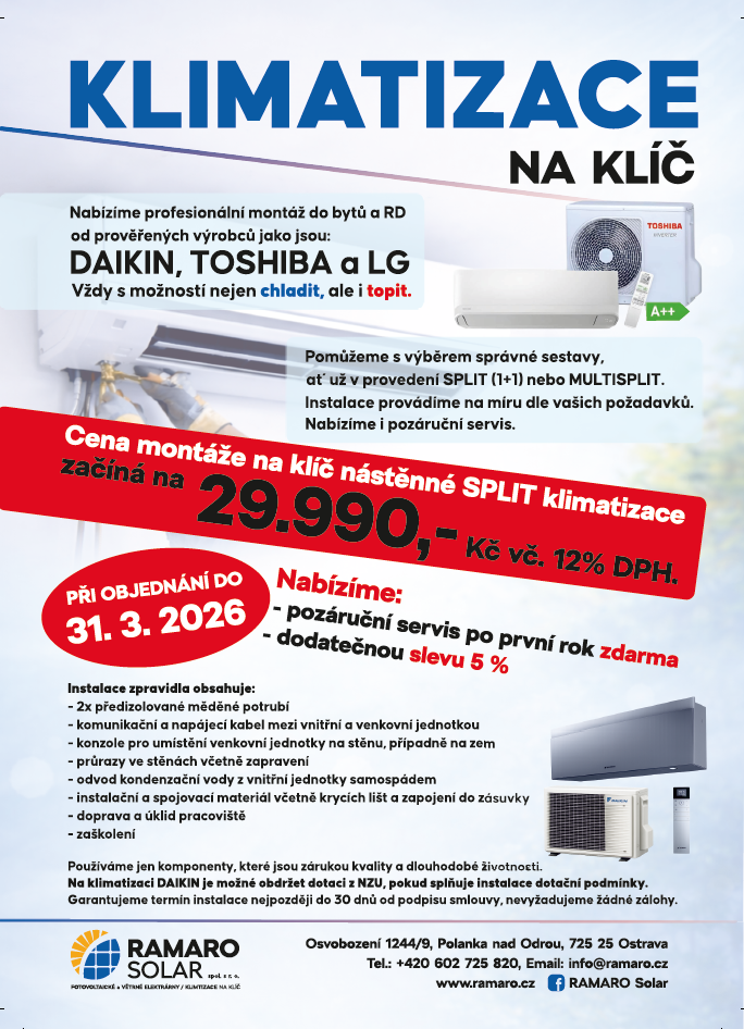 Domů » Blog s referencemi z instalací » RAMARO nabízí volné termíny pro instalace klimatizací DAIKIN, TOSHIBA a LG